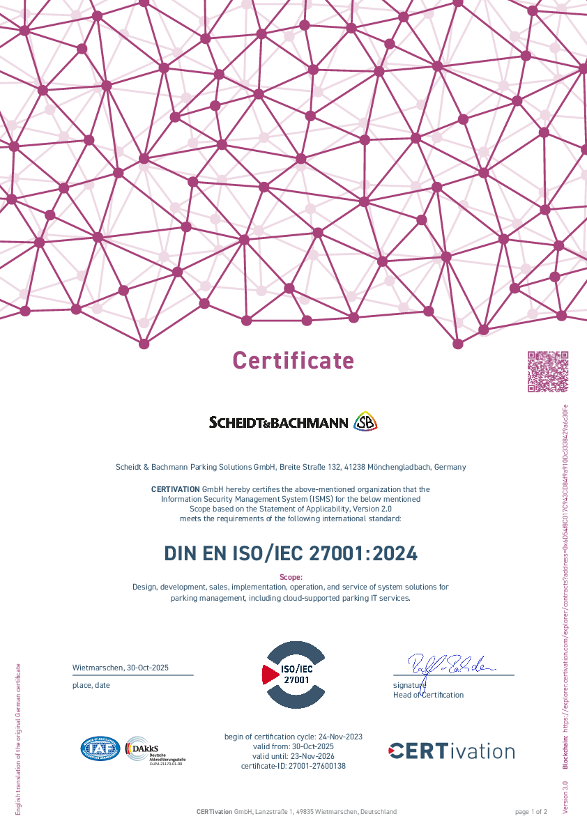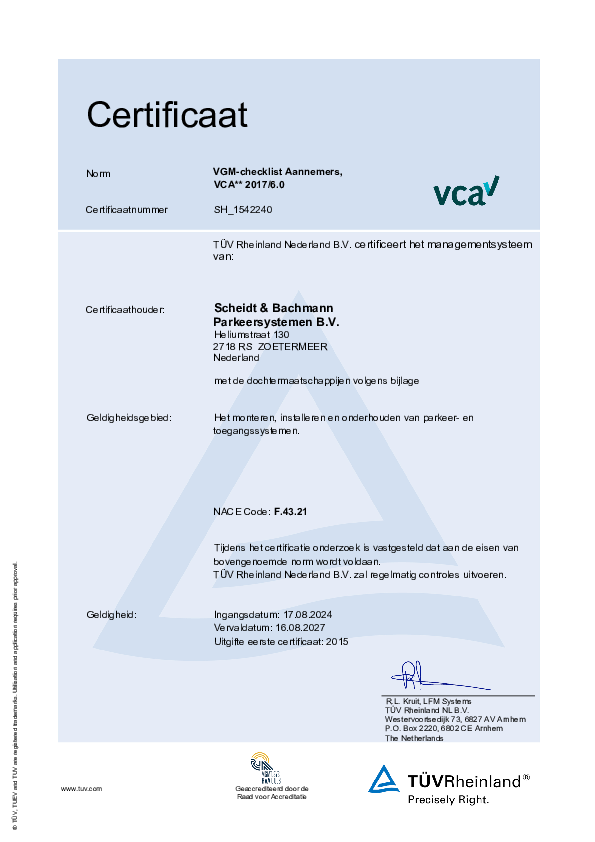 Onze certificeringen geven u de zekerheid van een partner die structureel werkt aan kwaliteit, veiligheid en duurzaamheid. Met Scheidt & Bachmann kiest u voor een betrouwbare organisatie die risico’s beheerst, mensen beschermt en parkeersystemen levert die klaar zijn voor de toekomst.